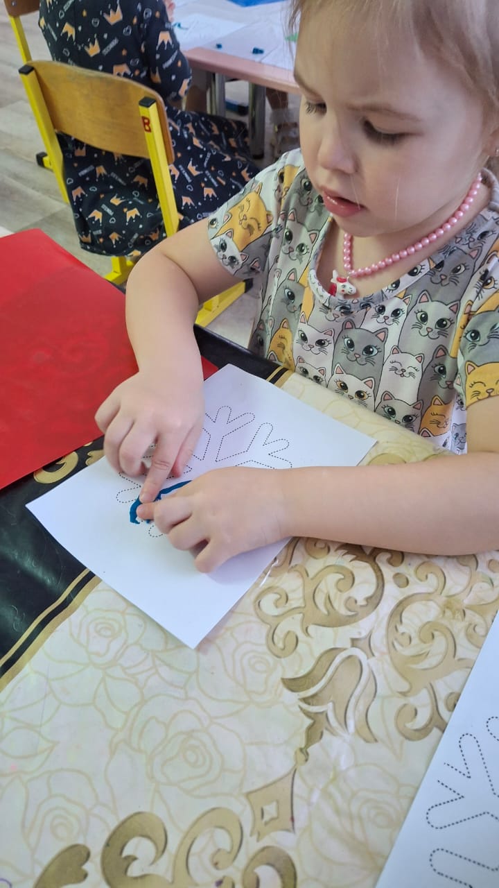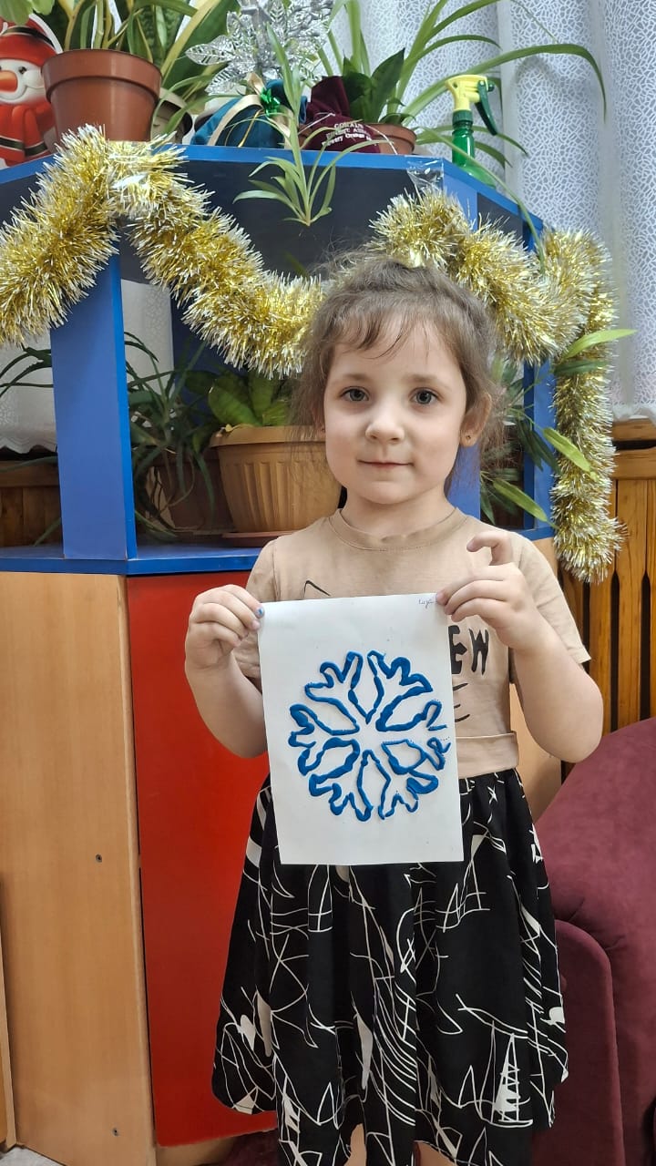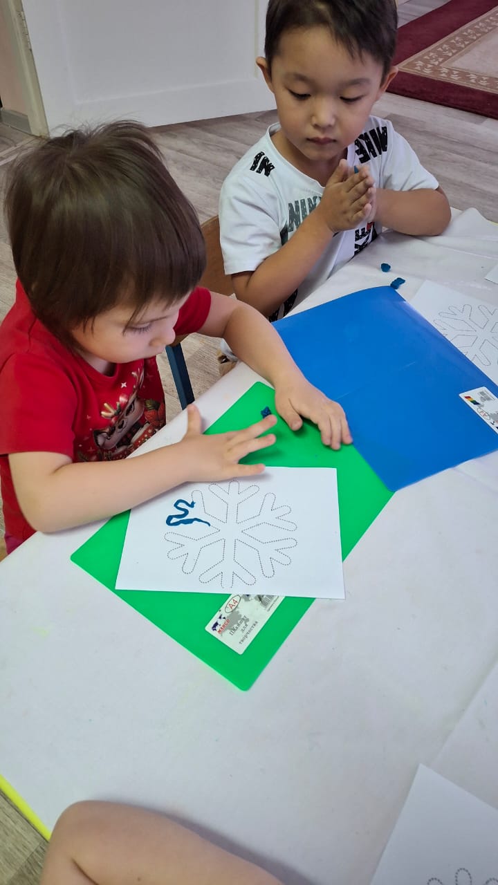Қыстың символы - қар, қар ұшқындары. "Түймедақ" тобында "Қар ұшқындары" ұйымдастырылған іс - әрекет өтті. Балалар өз жұмыстарын қуана орындады. Ермексазды жіңішке бумақ қылып домалатып, қар ұшқындарын контуры бойынша жайғастырды. Әр бала өзінің қар ұшқынын бәрінен де әдемі етуге тырысты.